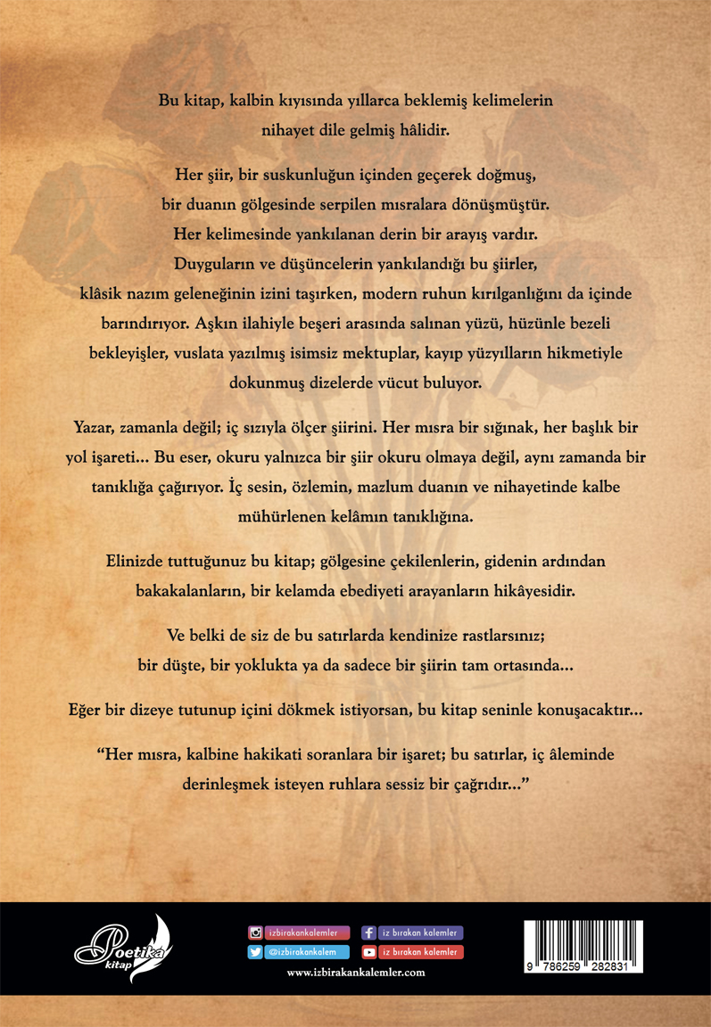 Yazar, zamanla değil; iç sızıyla ölçer şiirini. Her mısra bir sığınak, her başlık bir yol işareti… Bu eser, okuru yalnızca bir şiir okuru olmaya değil, aynı zamanda bir tanıklığa çağırıyor. İç sesin, özlemin, mazlum duanın ve nihayetinde kalbe mühürlenen kelâmın tanıklığına.